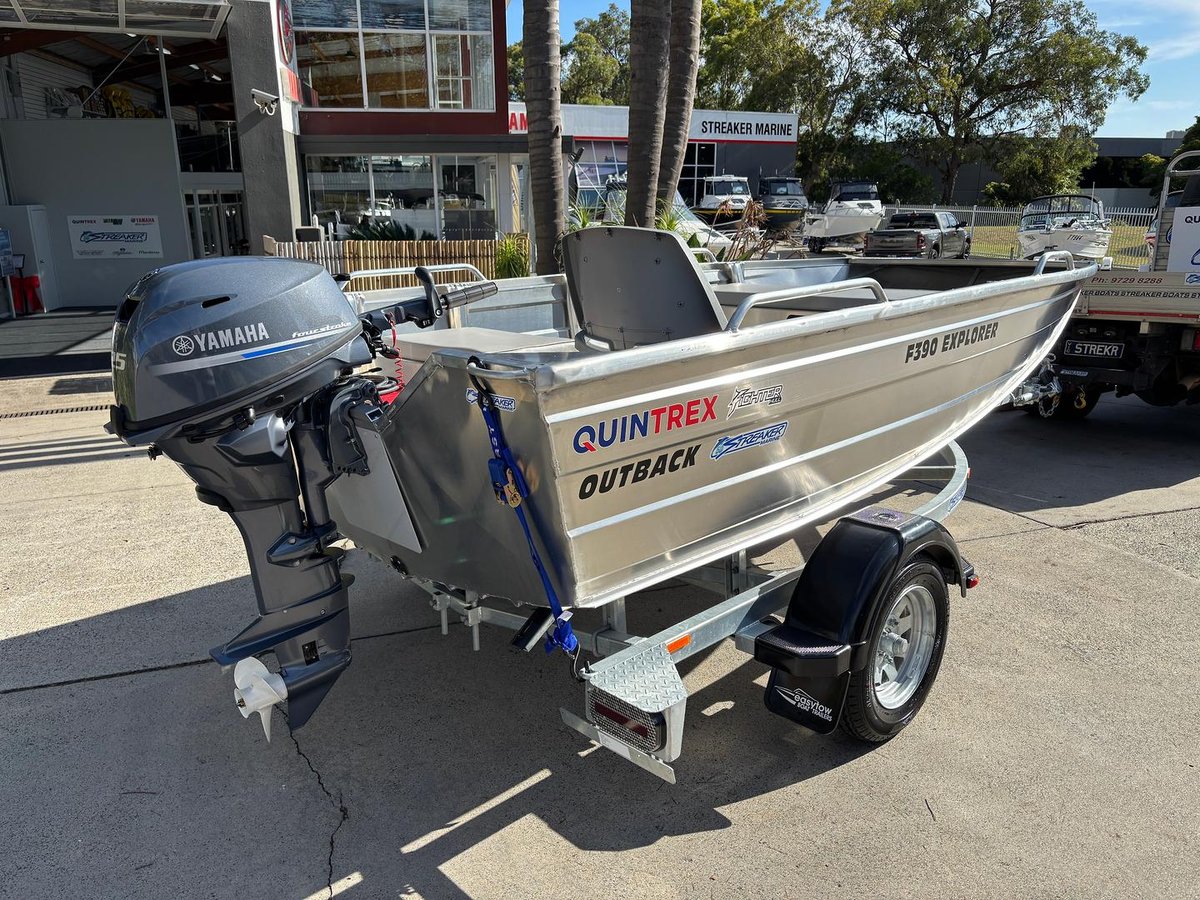 *** FLOOR STOCK SALE ON NOW ***QUINTREX F390 OUTBACK EXPLORER PREMIUM PACK INCLUDING YAMAHA F25LMHC EFI 4 STROKE ENGINE AND SITTING ON AN EASYTOW TRAILER